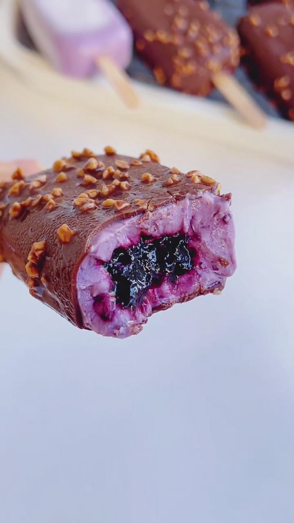 I made these popsicles with a rich blueberry cheese filling and a crunchy chocolate coating. The refreshing blueberry core inside adds a fun surprise, and the texture contrast between the creamy filling and crisp shell is irresistible.Blueberry Cheese Filling Crispy Popsicle (2)